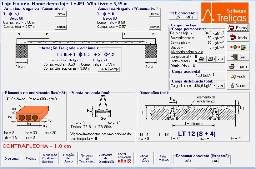 UTILIZAMOS PROGRAMA ESPECÍFICO PARA CÁLCULO DO ACRÉSCIMO DE FERRAGEM NECESÁRIA NO DIMENCIONAMENTO DAS VIGOTAS TRELIÇADAS E DE ACORDO COM A SOBREGARGA EXIGIDA.